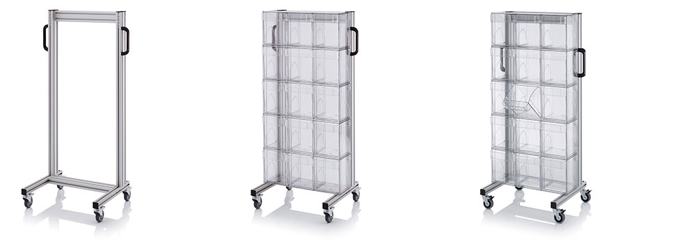 Der Systemwagen für Kippkästen von AUER Packaging sorgt dank kippbarer und transparenter Behälter jederzeit für maximalen Überblick und individuellen Zugriff. Unterschiedliche Kippkasten-Module lassen sich beliebig kombinieren. Bei der Bestellung können Sie wählen, ob der Systemwagen ein- oder beidseitig bestückbar sein soll.- Stabiles Aluminiumprofil